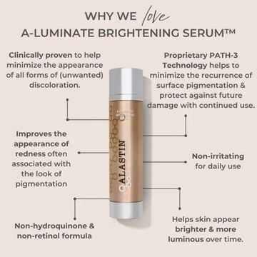 Alastin A-Luminate Brightening Serum is a non-irritating treatment formulated to visibly reduce dark spots, even skin tone, and enhance overall brightness. Using a blend of targeted antioxidants, peptides, and Tranexamic Acid, it helps calm inflammation and prevent future discoloration while supporting skin renewal. The result is a clearer, more radiant, and balanced complexion.