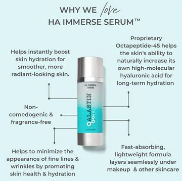 Alastin HA Immerse Serum delivers both instant and long-lasting hydration by boosting the skin’s own hyaluronic acid levels. Formulated with TriHex Technology® and Octapeptide-45, it helps plump, smooth, and improve skin elasticity while reducing the look of fine lines. Skin feels softer, more supple, and deeply hydrated with continued use.