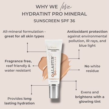 Alastin HydraTint Pro Mineral Broad Spectrum SPF 36 is a lightweight, all-mineral sunscreen that provides daily UVA/UVB protection while hydrating and nourishing the skin. It features a universal tint that evens skin tone for a natural, radiant finish. Rich in antioxidants, it helps defend against environmental damage while keeping skin healthy and protected.