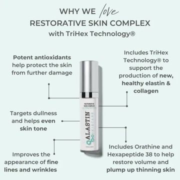 Alastin Restorative Skin Complex is a powerful anti-aging treatment formulated with TriHex Technology® to stimulate collagen and elastin production. It helps improve skin elasticity, reduce the appearance of fine lines and wrinkles, and restore a more youthful, radiant complexion. This nourishing formula also enhances hydration and supports long-term skin health.
