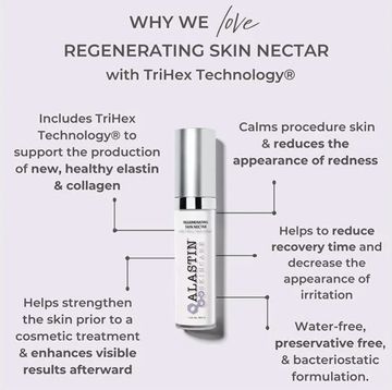Alastin Regenerating Skin Nectar is a lightweight, soothing serum designed to support skin before and after cosmetic procedures. Packed with TriHex Technology®, it helps clear out damaged collagen and elastin while promoting new, healthy skin for faster recovery and improved results. This calming formula reduces redness, enhances treatment outcomes, and leaves skin looking healthier and more radiant.